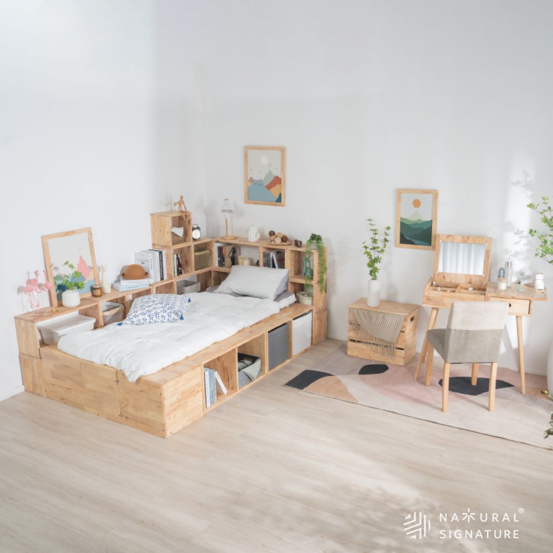 Kami mengekalkan simpulan kayu asli dan unsur semula jadi dalam perabot getah.