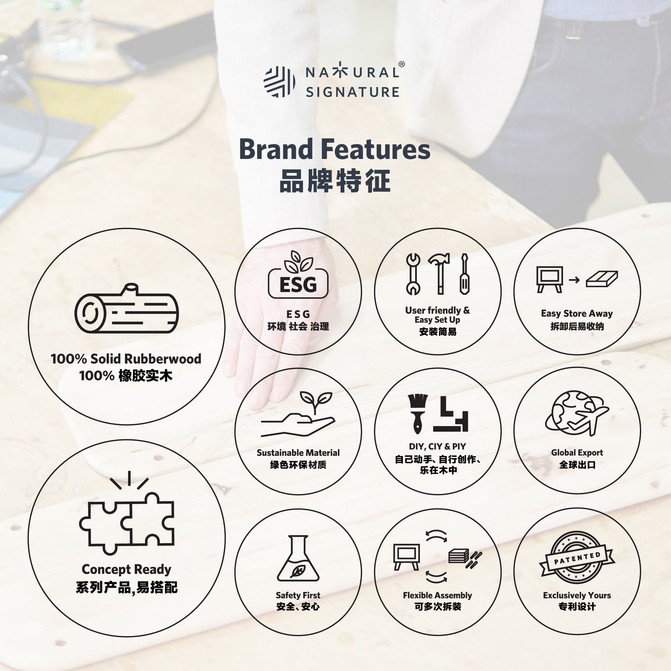 Kami mengekalkan simpulan kayu asli dan unsur semula jadi dalam perabot getah.