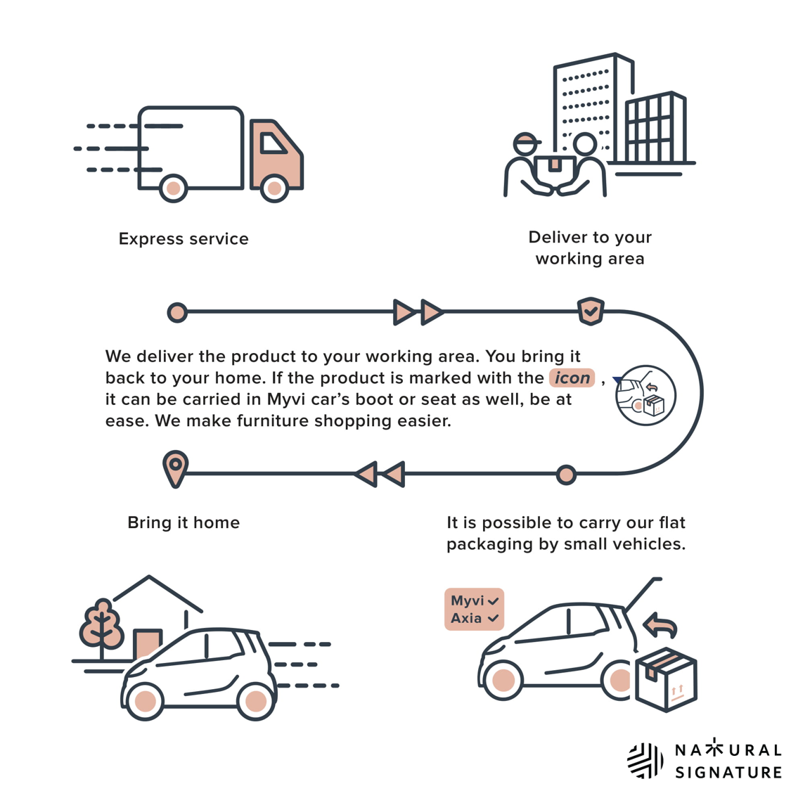 Cara pembungkusan yang sangat menjimatkan ruang untuk mengurangkan kos pengangkutan. Kebanyakan perabot keluaran kami boleh diangkut menggunakan kenderaan anda sendiri.